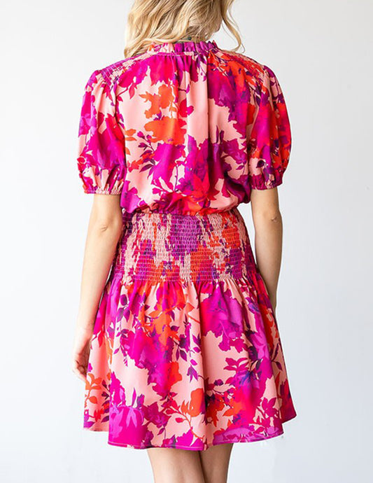 Rose Floral Smocked Waist Bubble Sleeve Flare Dress