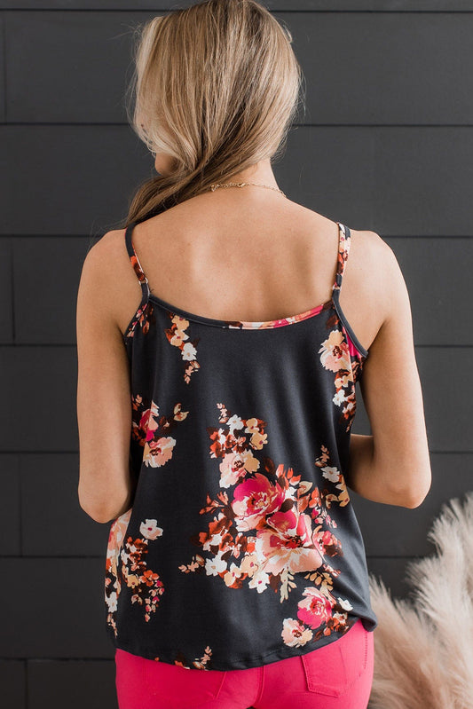 Black Floral Print Adjustable Spaghetti Strap V Neck Tank Top