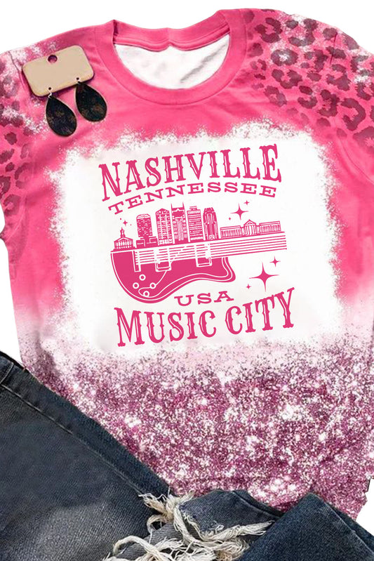Pink MUSIC CITY Nashville Leopard Bleach Graphic Tee