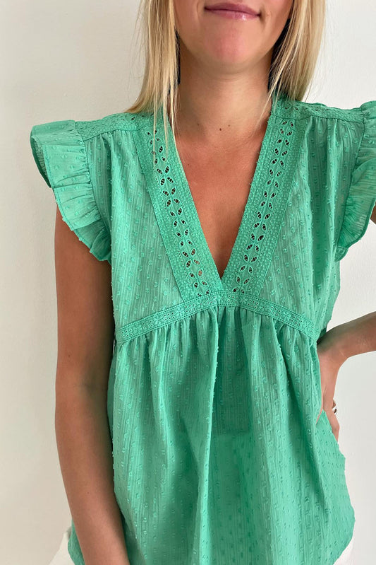 Green Eyelet V Neckline Ruffle Swiss Dot Top