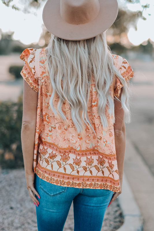 Orange Floral Print Ruffled Crew Neck Sleeveless Top