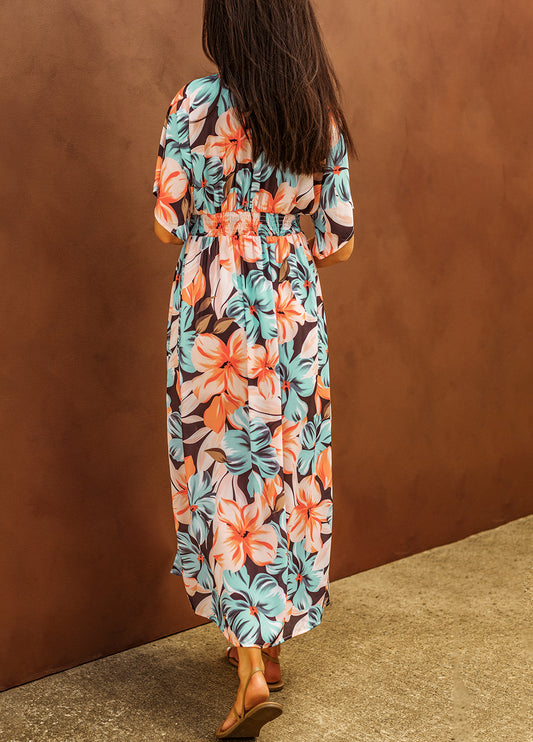 Orange Floral Kimono Long Dress with Slit