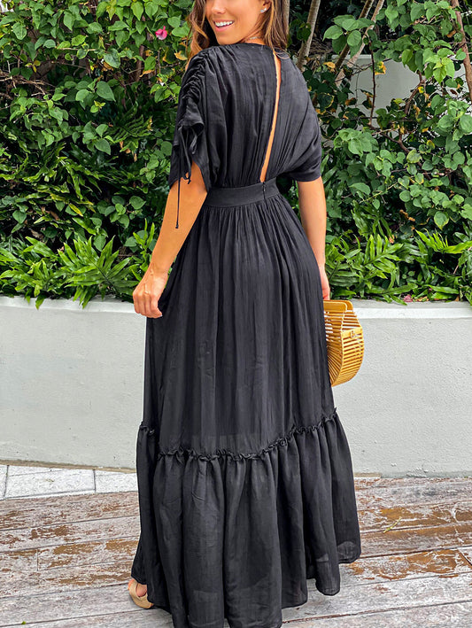 Drawstring Pleated Kimono Sleeve Ruffle Maxi Dress