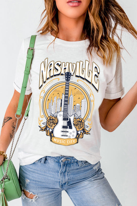 White Music City NASHVILLE Guitar Floral Print Graphic T Shirt