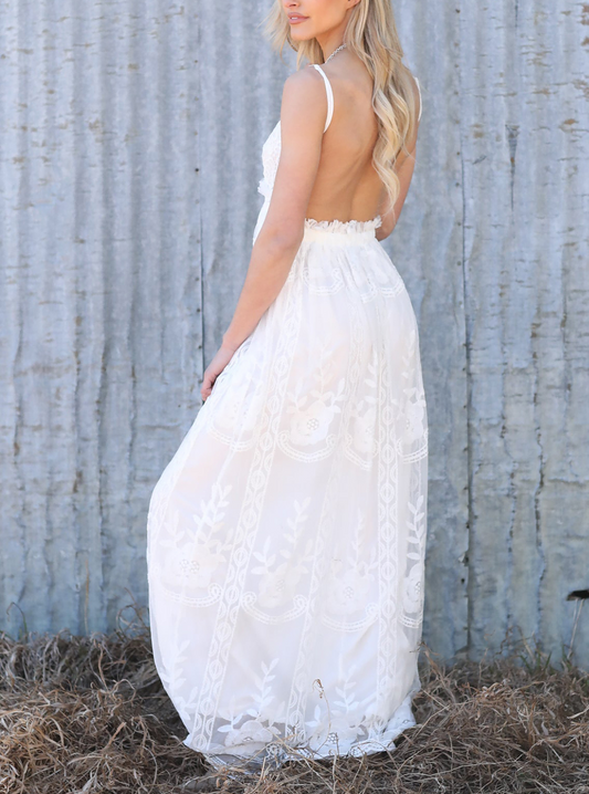 White Contrast Lace Backless Spaghetti Strap Maxi Dress