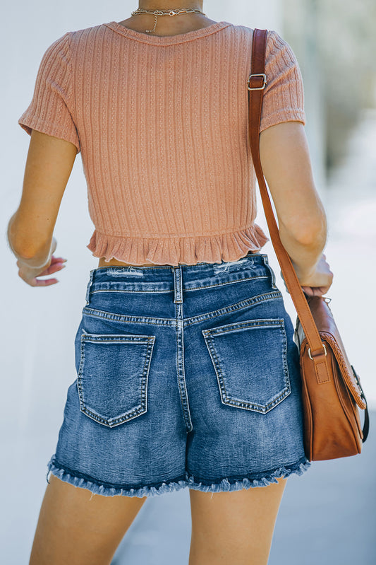Short Sleeve Ruffled Hem Ribbed Skinny Crop Top