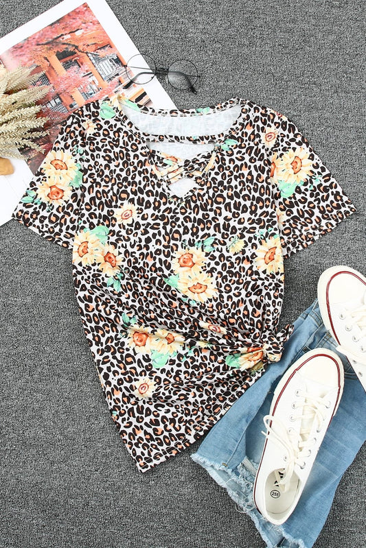 Leopard Sunflower Hollow Out Criss-cross Tee