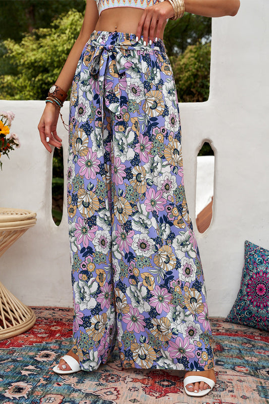 Purple Bohemian Floral Pattern High Waist Flared Pants