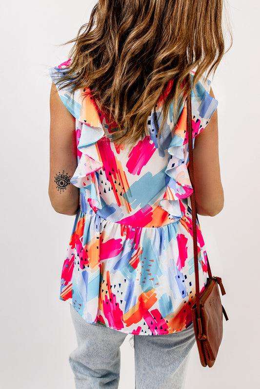 Multicolor Abstract Print V Neck Ruffled Tank