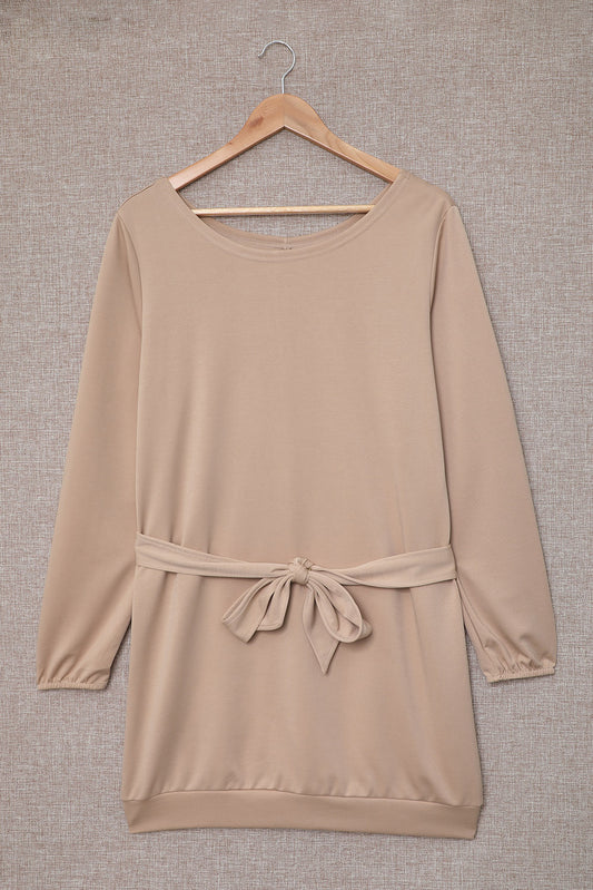 Khaki Crewneck Long Sleeve Belted Casual Mini Dress