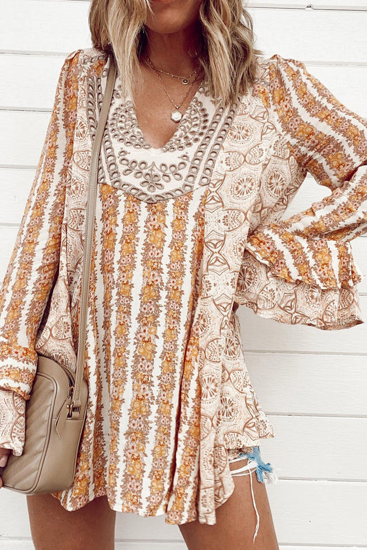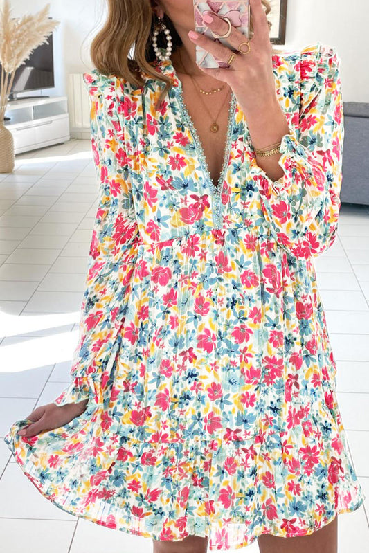 Yellow Mixed Floral Splicing Ruffled Bell Sleeve Mini Dress