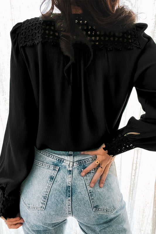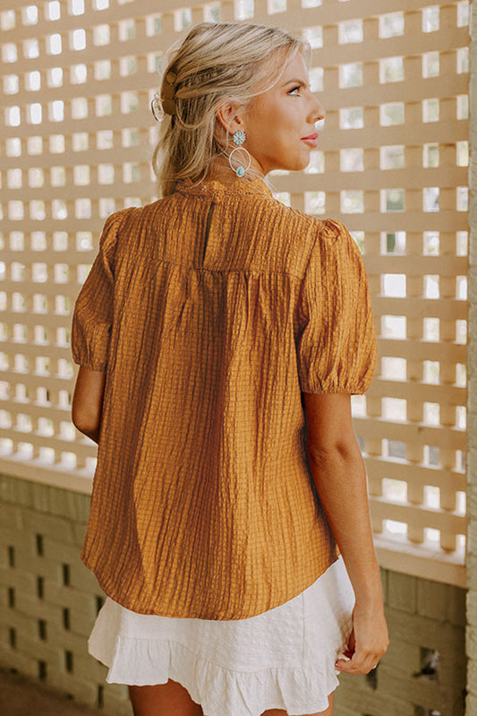 Orange Textured Crochet Keyhole Puff Sleeve Blouse