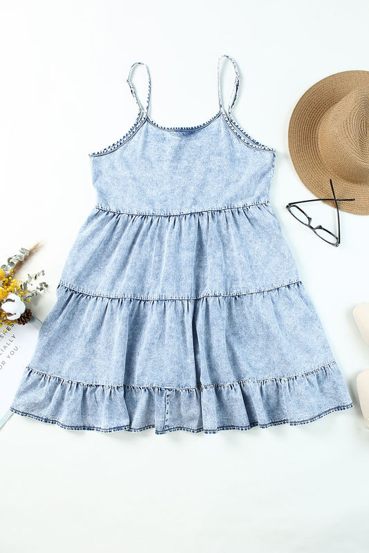 Sky Blue Adjustable Straps Tiered Ruffle Denim Dress