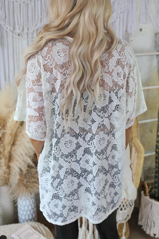 White Floral Lace Crochet Short Sleeve Open Front Kimono