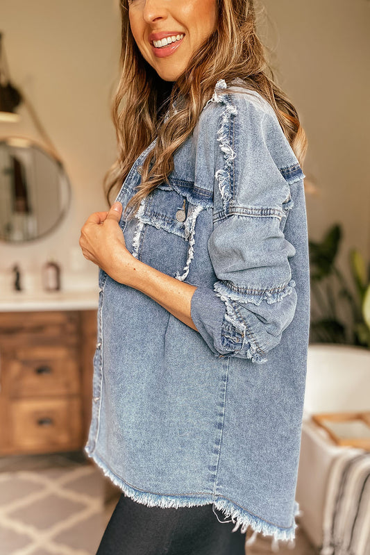 Sky Blue Acid Wash Buttoned Raw Hem Distressed Denim Jacket