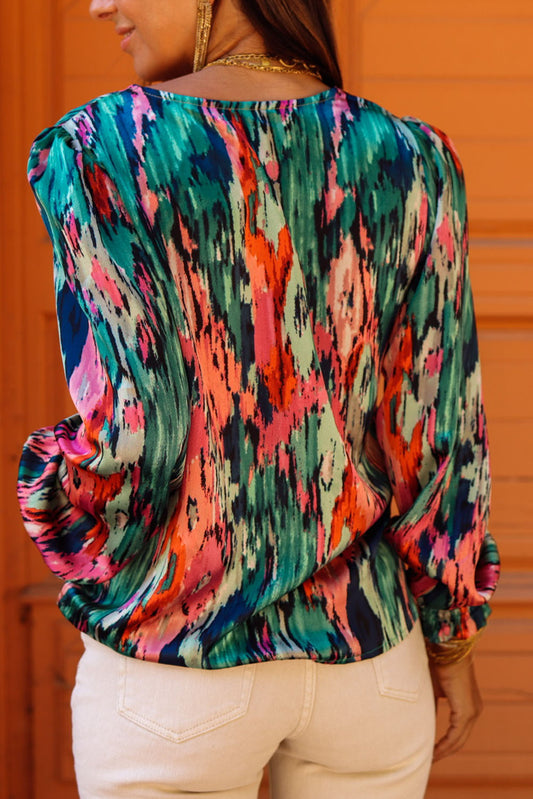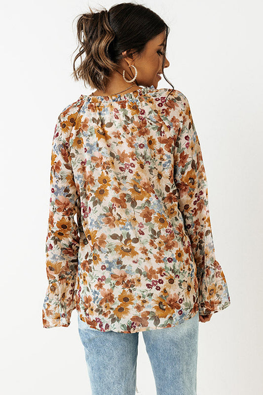 Orange Floral Print Flare Cuff Long Sleeve Blouse