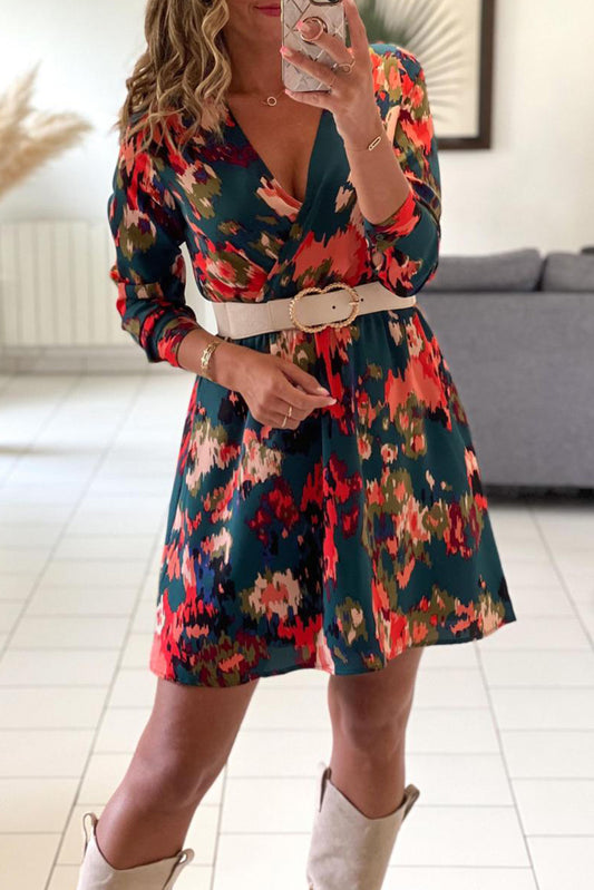 Abstract Print V Neck Puff Sleeve A-line Dress