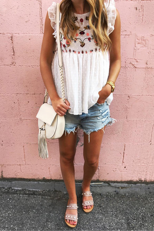 White Floral Embroidered Swiss Dot Ruffled Tank Top