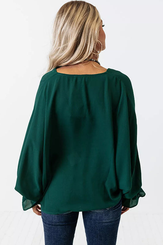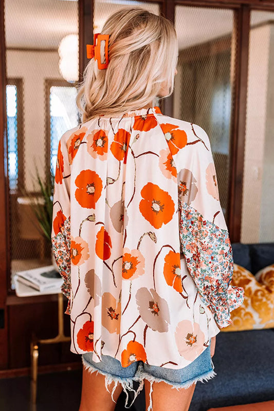 Orange Floral Print Ruffled Drawstring V Neck Blouse