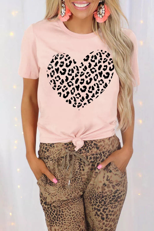 Pink Leopard Heart Shaped Print Crew Neck Graphic Tee