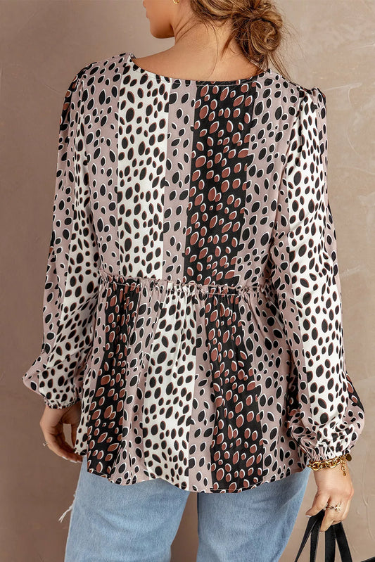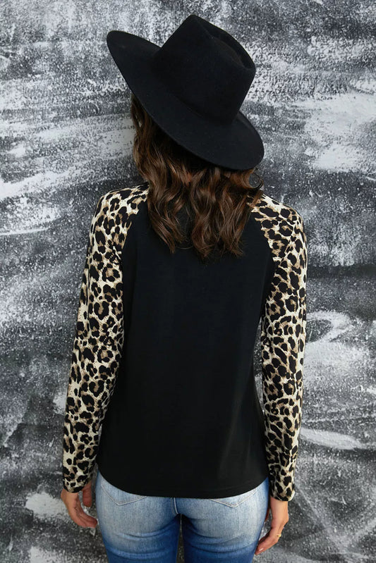 Leopard Pocket Notched Neck Raglan Sleeve Blouse
