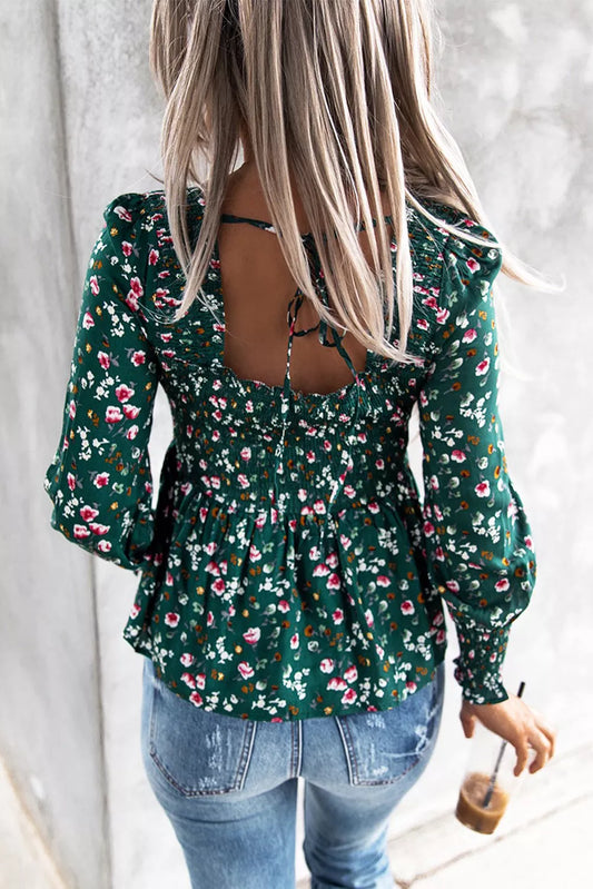 Floral Print Smocked Lace-up Square Neck Long Sleeve Top