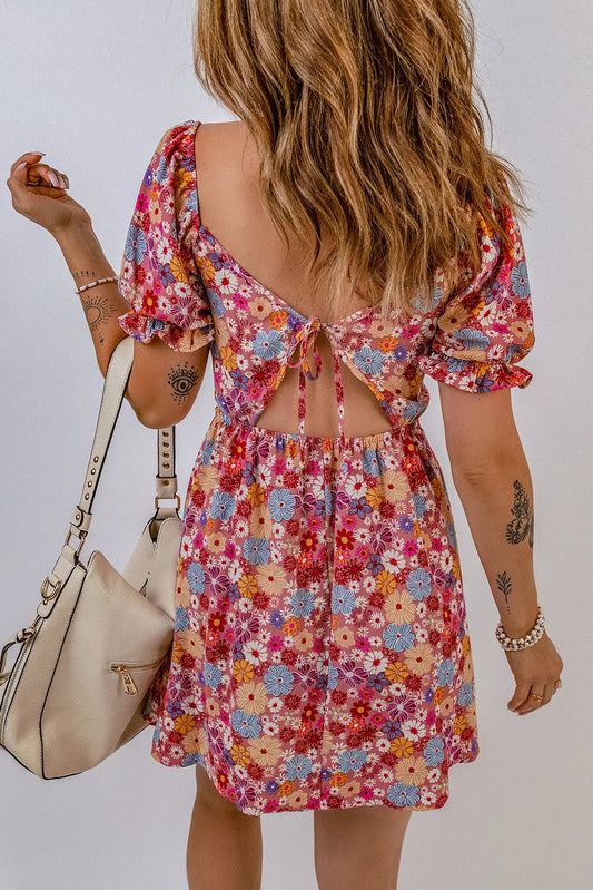 Pink Square Neck Short Puff Sleeves Floral Dress