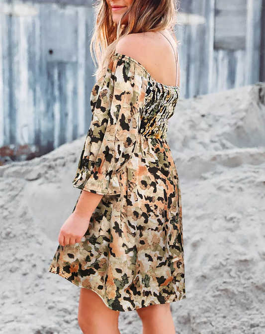 Multicolor Abstract Print Shirred Half Sleeve Square Neck Mini Dress