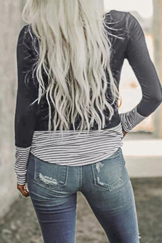 Rhinestone Beading Striped Patchwork Long Sleeve Top