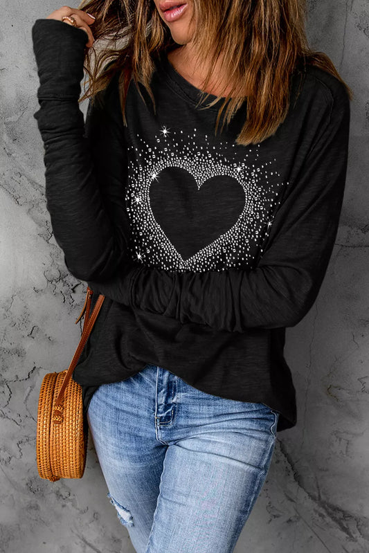 Black Rhinestone Heart Shape Print Long Sleeve Top