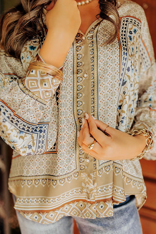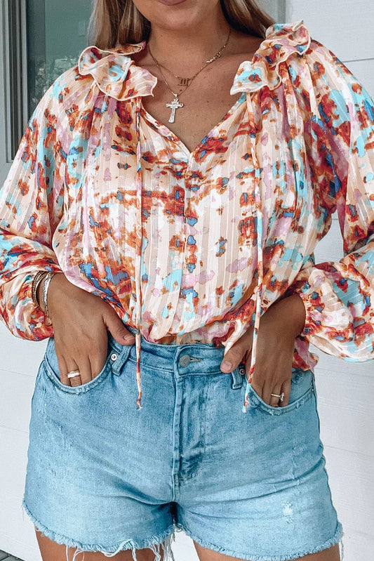 Multicolor Pattern Print Ruffled Pleated Long Sleeve Blouse