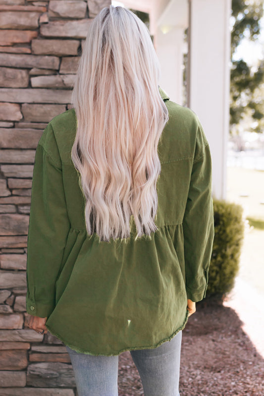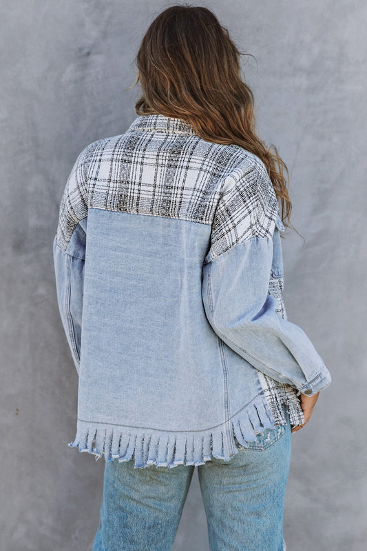 Plaid Patchwork Fringed Flap Pockets Denim Jacket