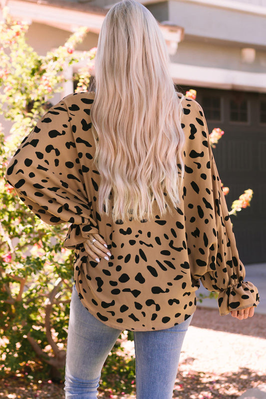Leopard V Neck Ruffled Cuffs Loose Blouse