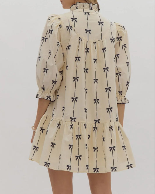 Cute Bowknot Printed Bubble Sleeve V Neck Mini Dress