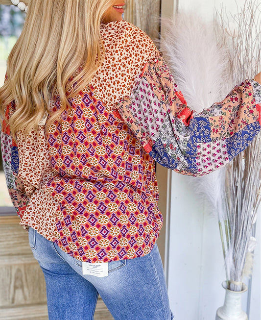 Mixed Floral Printed Long Sleeve Tied V Neck Blouse