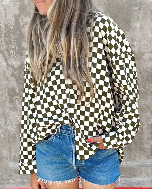 Checkerboard Printed Drop Shoulder Loose Casual Shirt