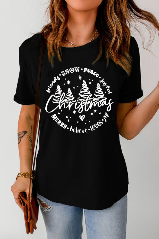 Black Christmas Tree Letter Graphic Print Crew Neck T Shirt
