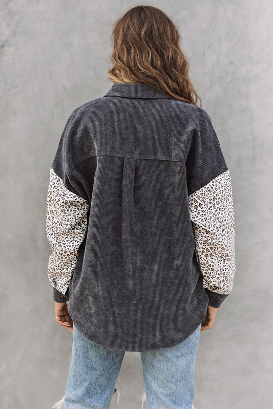 Gray Leopard Patchwork Corduroy Buttoned Shirt Jacket