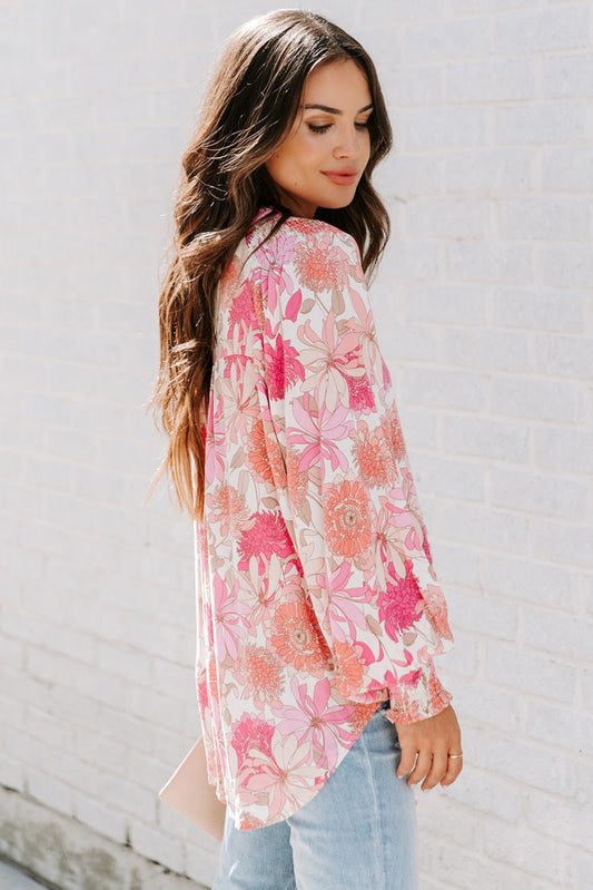 Multicolor Vibrant Floral Tie V Neck Puff Sleeve Blouse
