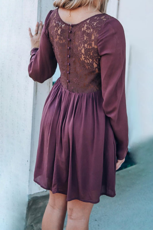 Purple Buttoned Sheer Lace Back Long Sleeve Dress