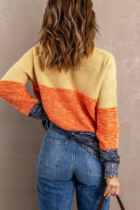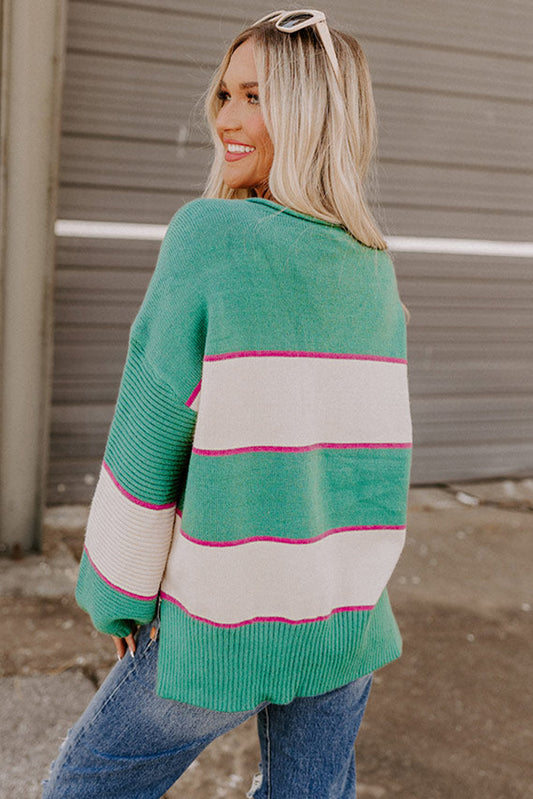Green Striped Color Block Knitted Buttoned V Neck Sweater