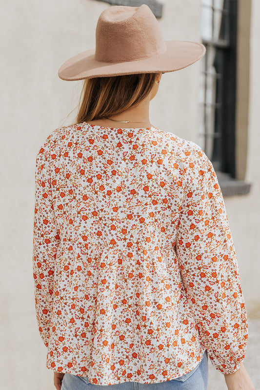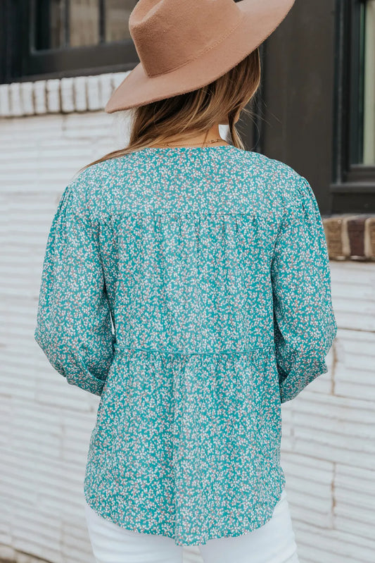 Sky Blue Floral Print Drawstring High Low V Neck Blouse