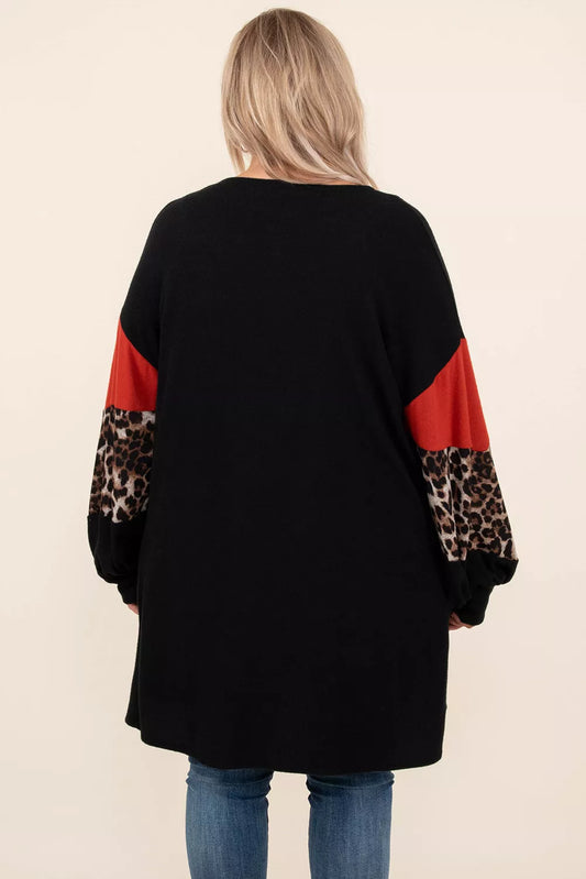Black Leopard Color Block Sleeve Plus Size Cardigan