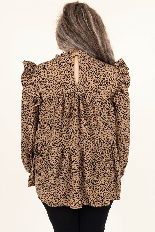 Leopard Frilled Shoulder Decor Plus Size Babydoll Top
