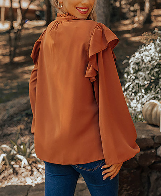 Orange Ruffled Pleated Buttoned V Neck Blouse