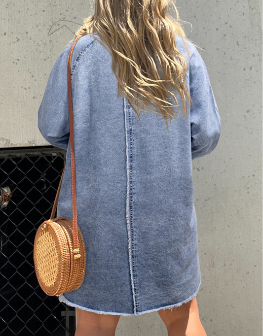 Wash Long Sleeve Button Up Raw Hem Pocketed Denim Dress