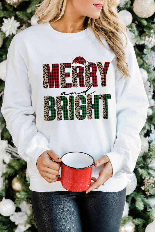 White MERRY BRIGHT Leopard Plaid Print Graphic Sweatshirt