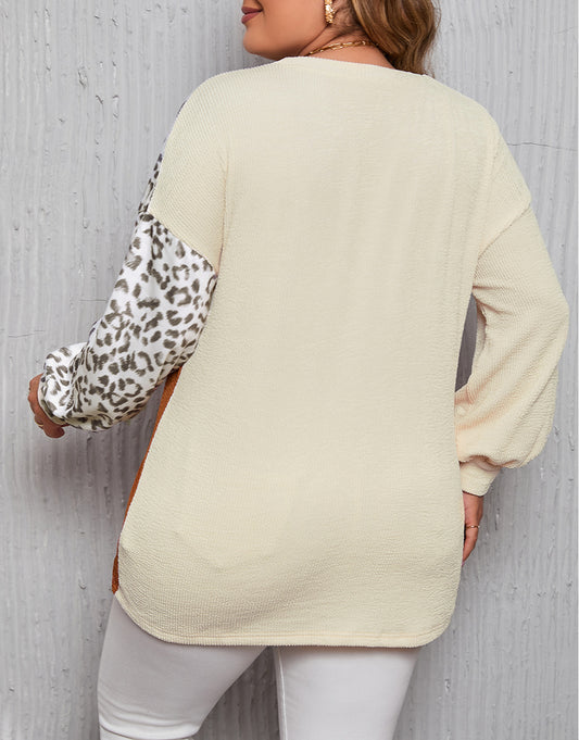 Ribbed Color Block Leopard Splicing Plus Size Top