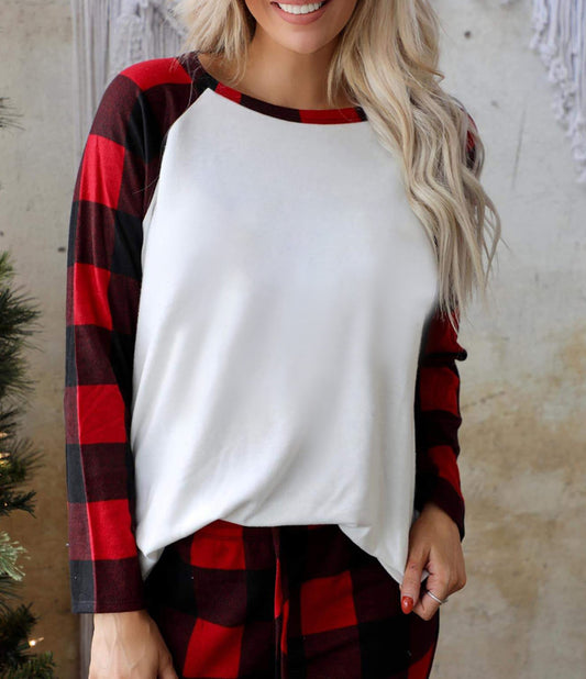 Red Plaid Raglan Sleeves Top and Drawstring Pants Lounge Set