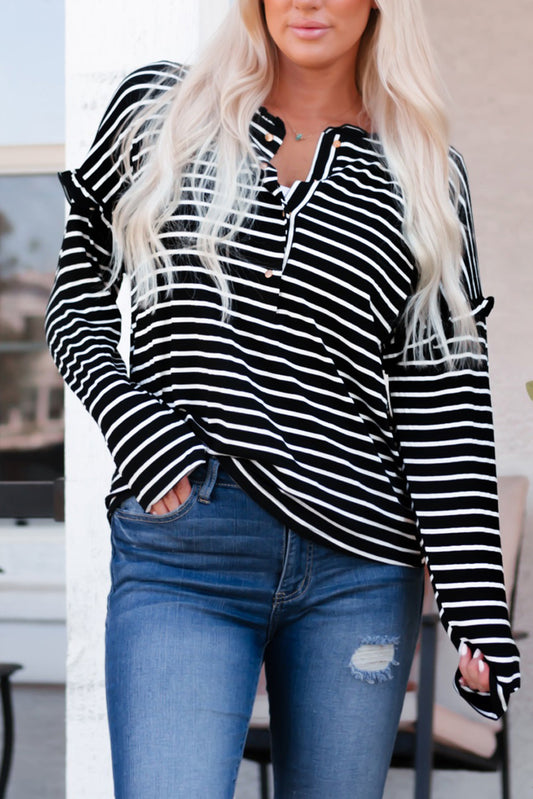 Striped Print Ruffled Buttoned Long Sleeve Top